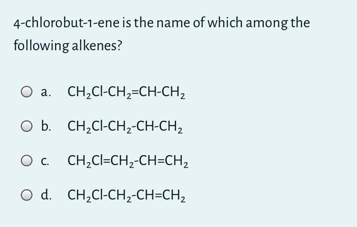 4-chlorobut-1-ene is the name of which among the following alkenes a CH2Cl-CH2CH-CH2 b CH2Cl-CH2-CH-CH2 c CH2ClCH2-CHCH2 d CH2Cl-CH2-CHCH2. The structure CH 2 Cl-CH 2-CHCH 2 has the name 4Chlorobut-1-ene according to the IUPAC naming system. A Butadiene b 12-butadiene c 13-butadiene d 2-butadiene Answer.