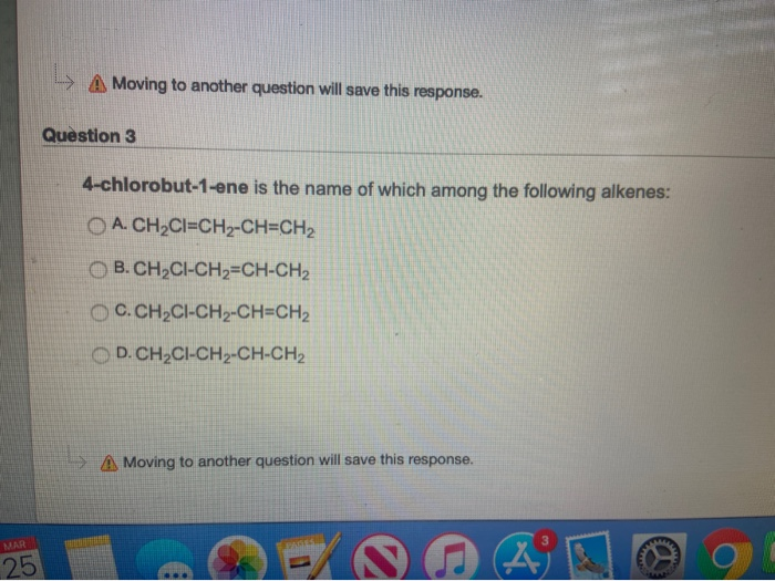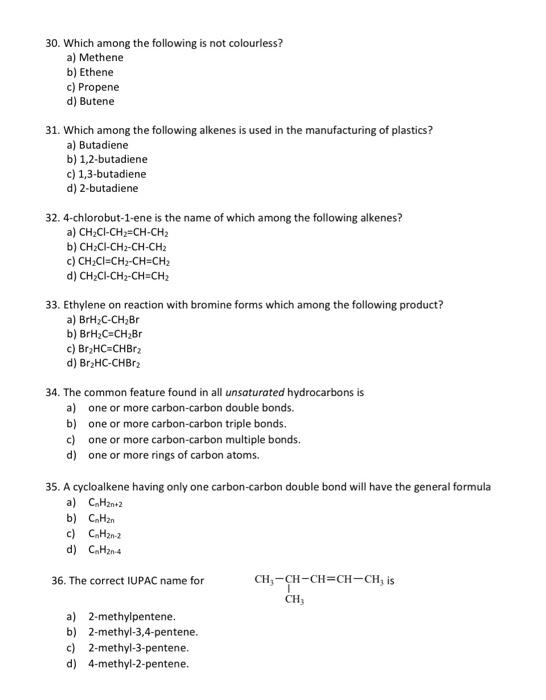 4-chlorobut-1-ene is the name of which among the following alkenes. MAR 25 A Moving to another question will save this response. Which of the following reactions is common in alkenes.